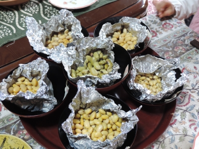 ひととおり話したあと、大きな二段の蒸し器で蒸しておいた大豆6種類を食べてみることにしました。