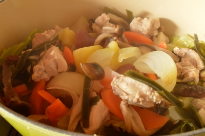 出来立ての一品、塩こうじ漬けチキンと野菜の蒸し焼き