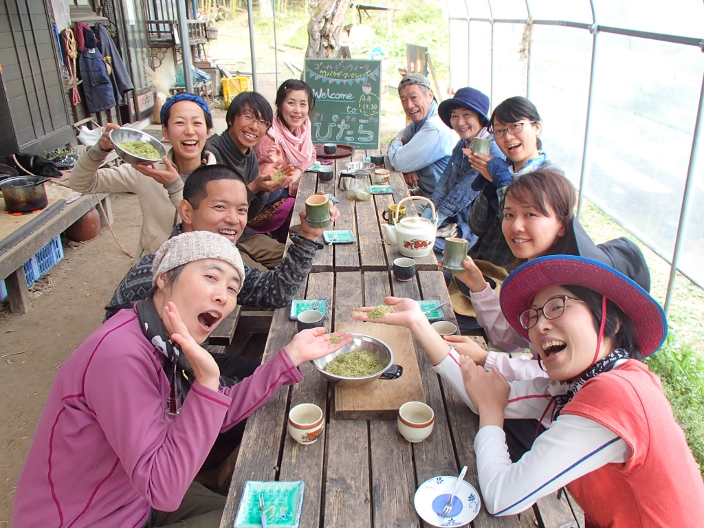 作業の後は温泉に行って汗を流し、夜は竹のぐい飲みで乾杯。