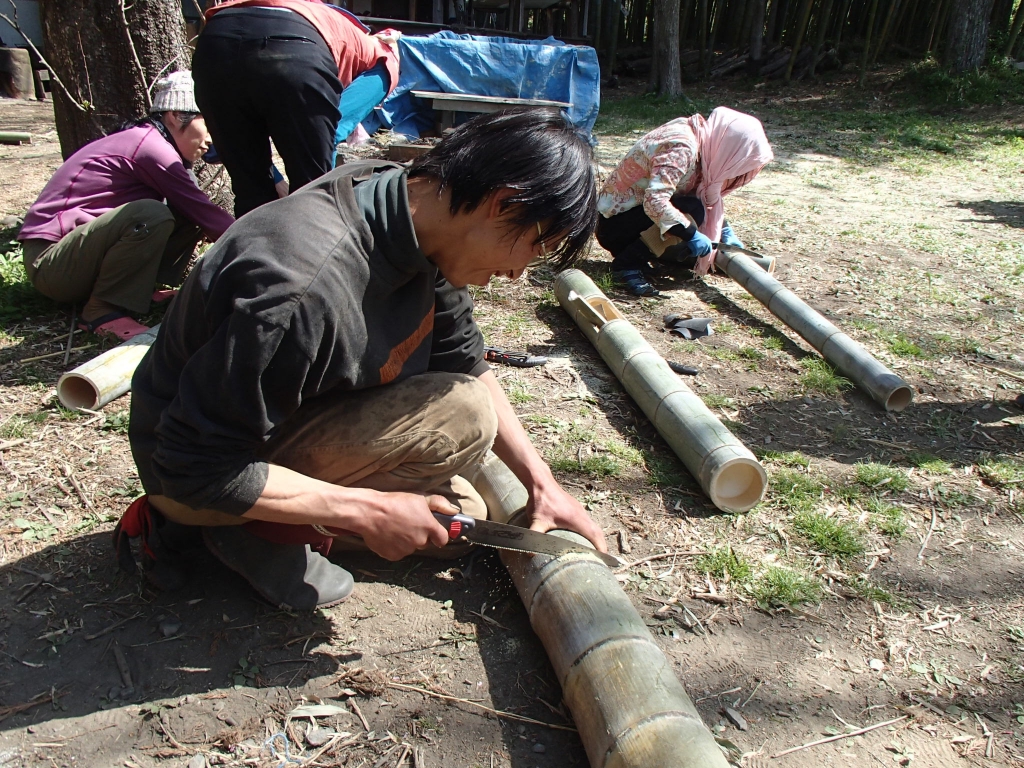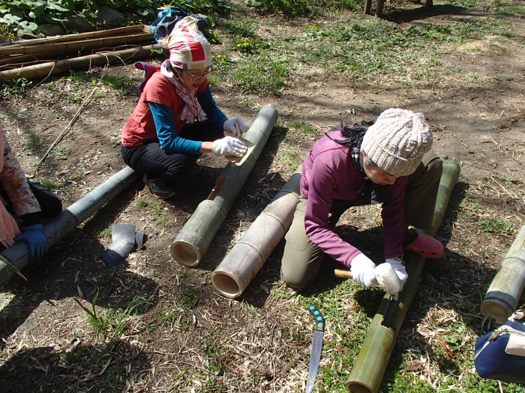 竹を割る作業は中々ハードです。みなさんナタとトンカチも使いこなしています!