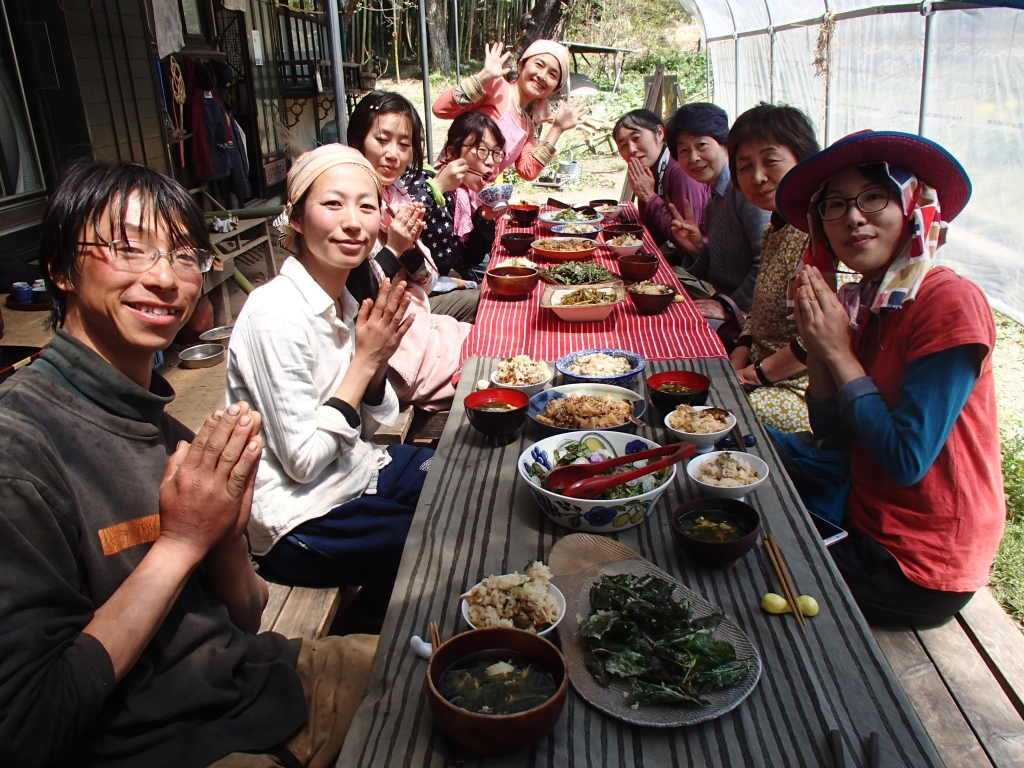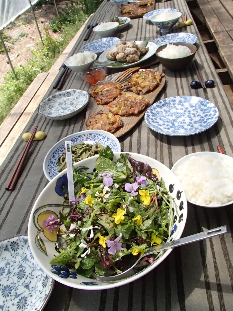 作業の前に腹ごしらえ!間引き菜の彩りサラダに、はだか麦と里芋のナゲット、じゃがいものちぢみ風!野菜がまだあまり採れない時期だけど山菜や貯蔵していた根菜で豪華な食卓!どれも美味しかった~