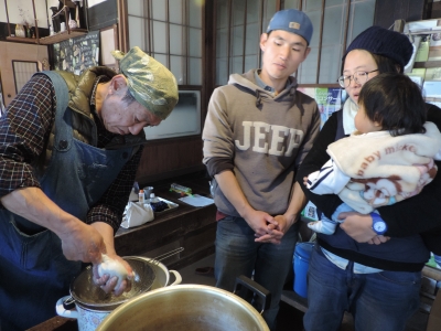 風邪が流行っていたため、間際になって2件キャンセルが出てしまい、参加者が少なくてどうなるかなぁと心配でしたが、参加者4組+ウーファー2人+ぴたらスタッフ5人で、わいわいと大勢で楽しい豆腐作りとなりました!