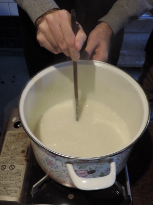 豆乳を熱して温度をみながら「今だ!」というタイミングでにがりを入れます。その際にまんべんなくにがりが混ざるように鍋の中の豆乳の動きを止めなければいけません。