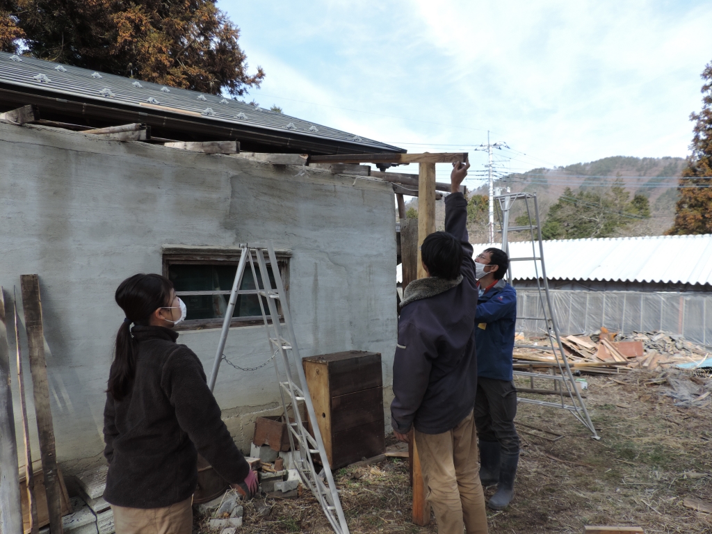トタンを取り外した軒に新しい柱を立てていきます。