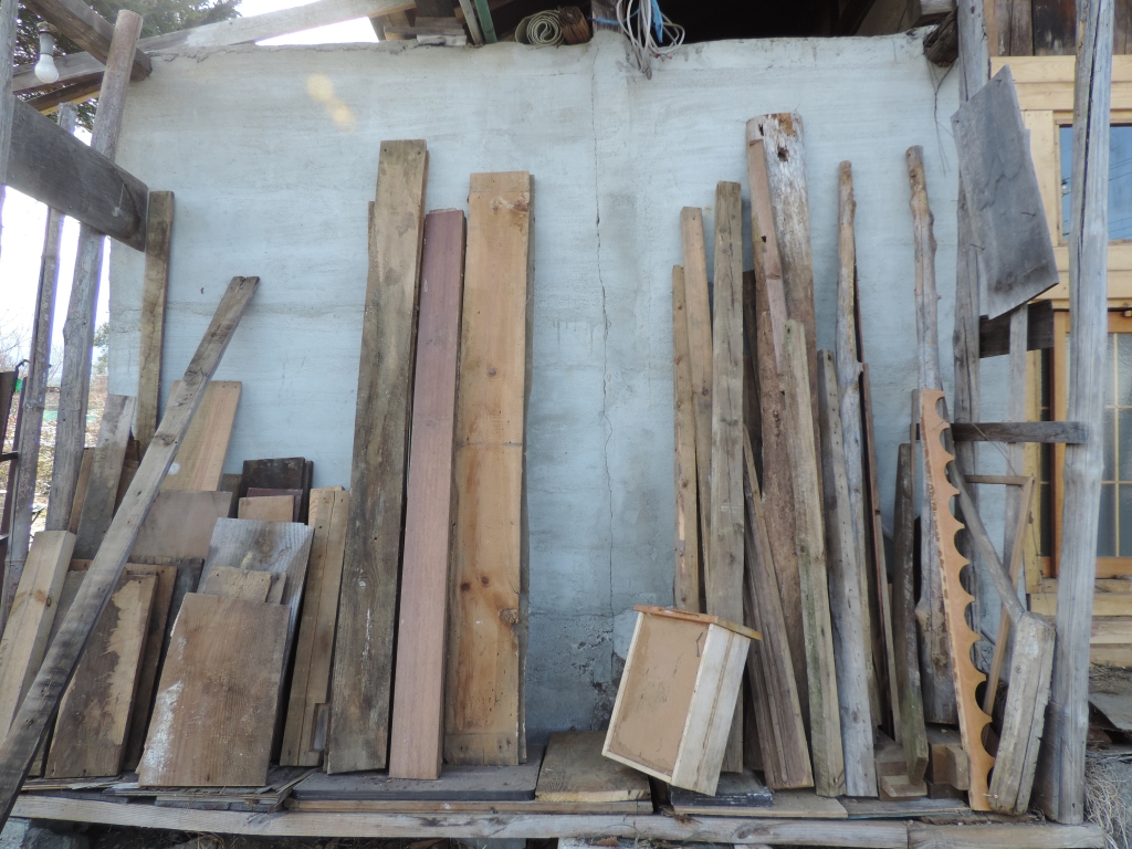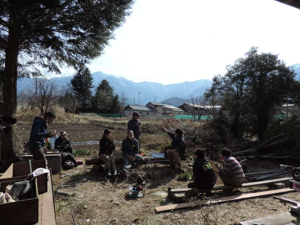 伐採した木の丸太や縁側に腰かけ、気分はすっかり開墾者!