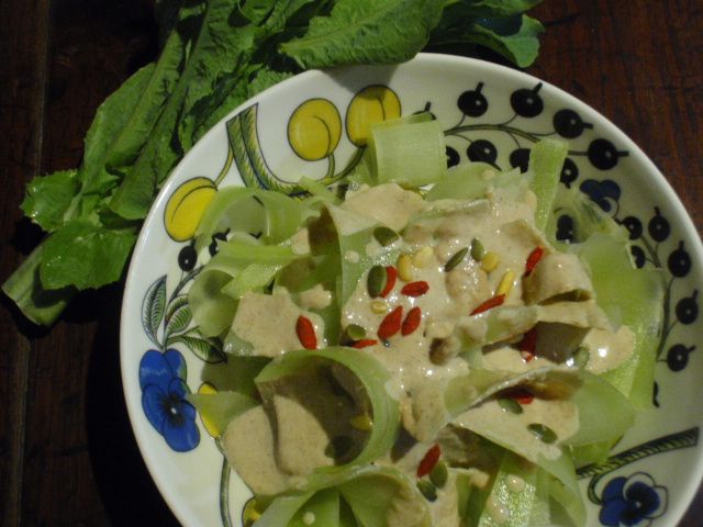 皮がスジっぽくて固くて(特に根元のほう)剥くのが大変ですが、包丁とピーラーを駆使してスジっぽいところを全て取りのぞき(がんばったよ、自分!)、柔らかい部分をピーラーで薄く削いで水につけてシャッキリさせたら水気をよ~くきって、器に盛ったらお手製のゴマ味噌豆乳ドレッシング(よく擦ったゴマにてんさい糖・味噌・豆乳・酢を足して混ぜるだけ)と松の実・クコの実・カボチャの種をかけました。びっくりの美味しさでしたヨ。(*゜ー゜)b