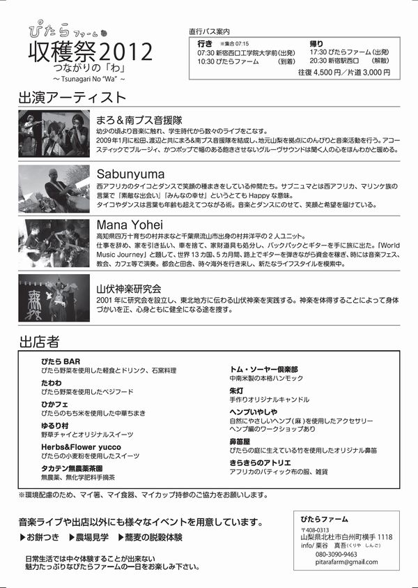 音楽ライブや出店以外にも南アルプスの山々を望める畑の見学や古民家前でのお餅つきなど、内容盛り沢山の一日となっています。