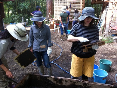 土、砂、細かく切った稲わら、ヤギさんの糞、そして水をたっぷり入れてよーく混ぜ込みます。