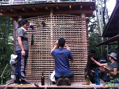 ボトルウォールを作る班は、合わせて土壁の塗り方のデザインも考えました。