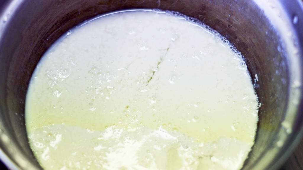 蜂蜜やおから、きなこを混ぜて湯煎で石鹸の硬さを調節しながら、練っていきます。