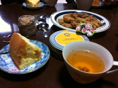 ゲストのケンちゃんが持って来てくれた紅茶、りっちゃんが作ってくれたクッキー、そして御近所のユキさんが持って来てくれたシフォンケーキ。