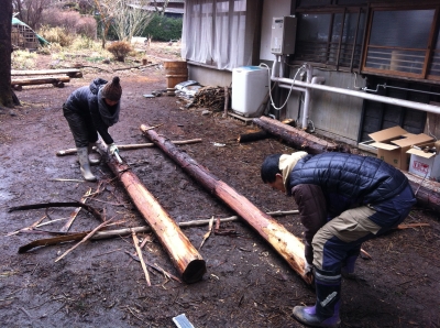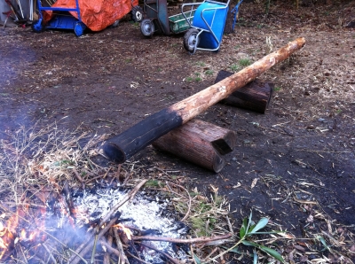 更に皮をむいた丸太の地中に差し込む箇所を火であぶり、炭化させて腐食させ辛くします。