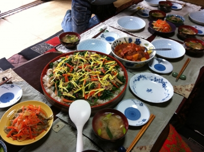 さて、畑見学を終えてお昼ご飯です。 今回も豪華な食事です。よだれが止まりません、ゴックン(笑)