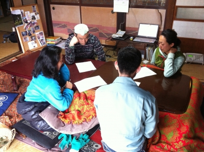昼寝を終え、午後はいよいよコンポストトイレ作りを始めます。その前にコンポストトイレの講義。 皆真剣な眼差しです。