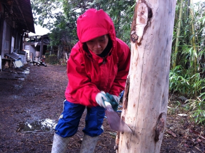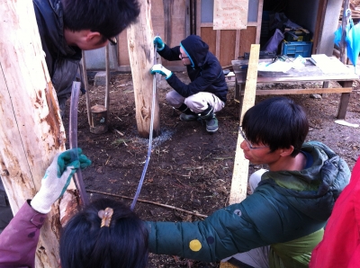 この日の作業はトイレのタンクを設置する為に穴掘り。 周囲の竹の根っこと大きな石が邪魔をして中々掘り進めることが出来ません。