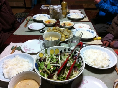 温泉に入り、お腹ぺこぺこ。 今回の夜ご飯は泰斗さん特製のタイカレーと彩華さん特製の青パパイアサラダ。 青パパイアは参加者のモモカさんのお土産です。 美味しくて大満足。
