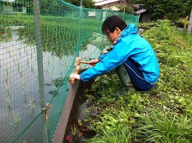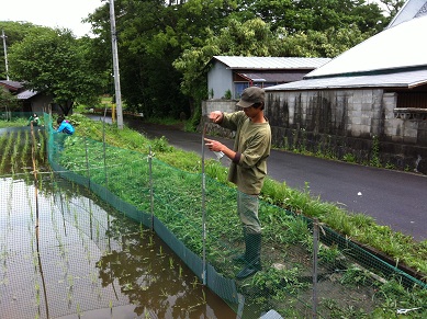 キツネやイタチの侵入を防ぎ、子ガモも田んぼから逃げ出さないようにする為、まずは回りにネットで囲いを作ります。