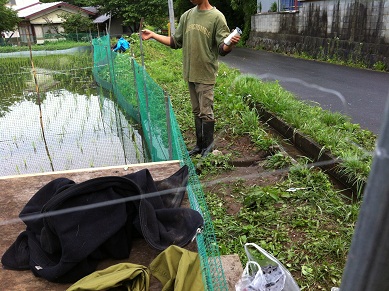 厳重に防御をほどこした田んぼに、いよいよ小ガモを放鳥します!