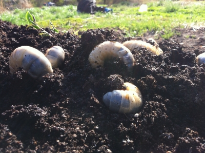 途中、堆肥置き場に行き掘りあげたところ、カブトムシの幼虫がうじゃうじゃ。