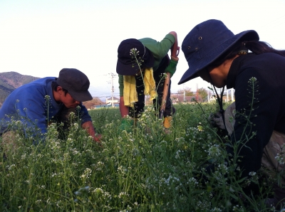 土に元気を与えるべく、泰斗さんが力強く撒いていきます。