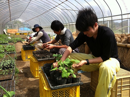 ハウス内では午前中に引き続き鉢上げ作業を行いました。