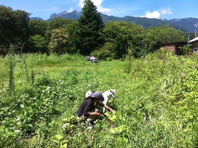 畑に勢い良く生える雑草を鎌で地道に刈っていきます。