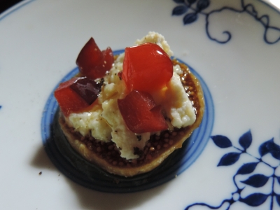 前菜には柚子ジュース漬けのイチジクの上に島豆腐塩麹漬けと
