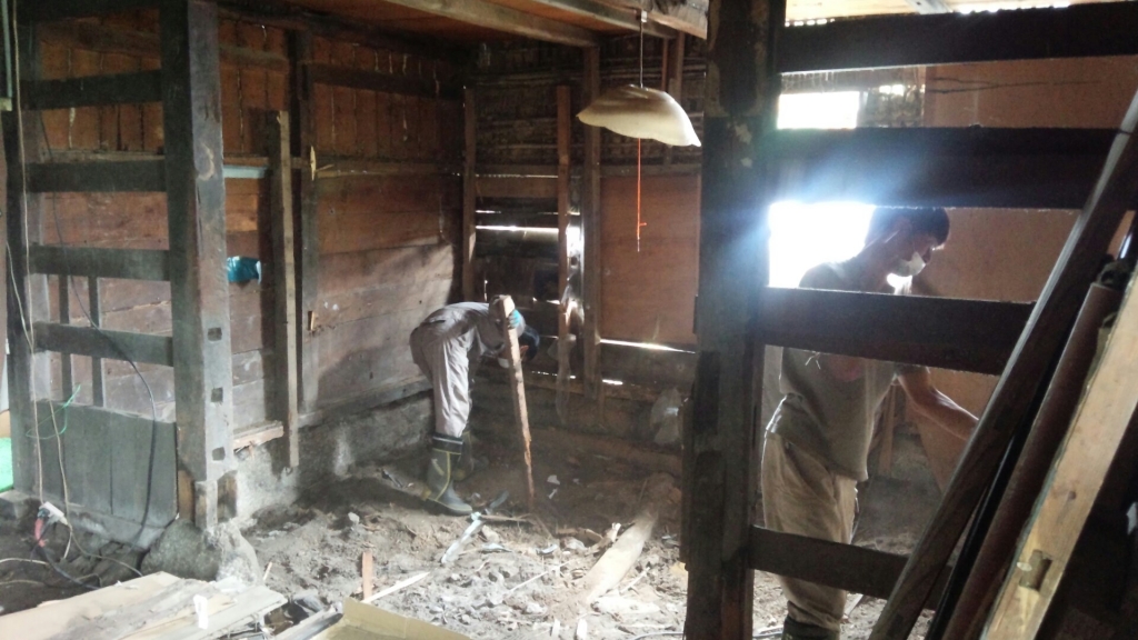 ・ 崩れた土壁の取り壊しと、窓や壁板の取り付け