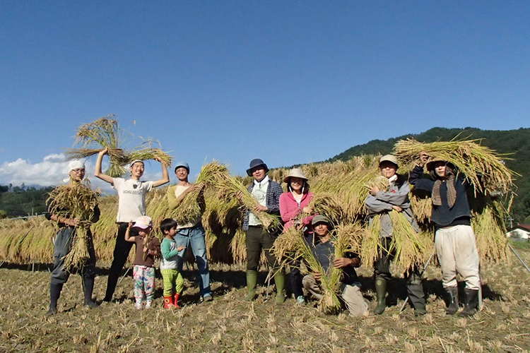 田んぼではお田植え(6月)、田車を使った除草作業(6~7月)、稲刈り&ハザ架け(10月)などが行われます。