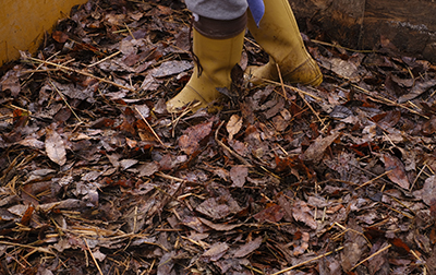 夏野菜を育てるに不可欠な温かい床=温床は、近年電熱マットが主流ですが。ぴたらでは昔ながらの踏み込み温床でやっています。 地域の山から落ち葉や米ぬかを集め、それらを水と混ぜ合わせて、木枠に踏み込みます、空気と窒素分と水分の割合がうまくいけば5日程度で発酵熱がでてきます、その暖かさを活用して苗を育てます。 その温床の有機物は、2年ほど寝かせ苗を育てる時の土として使います。